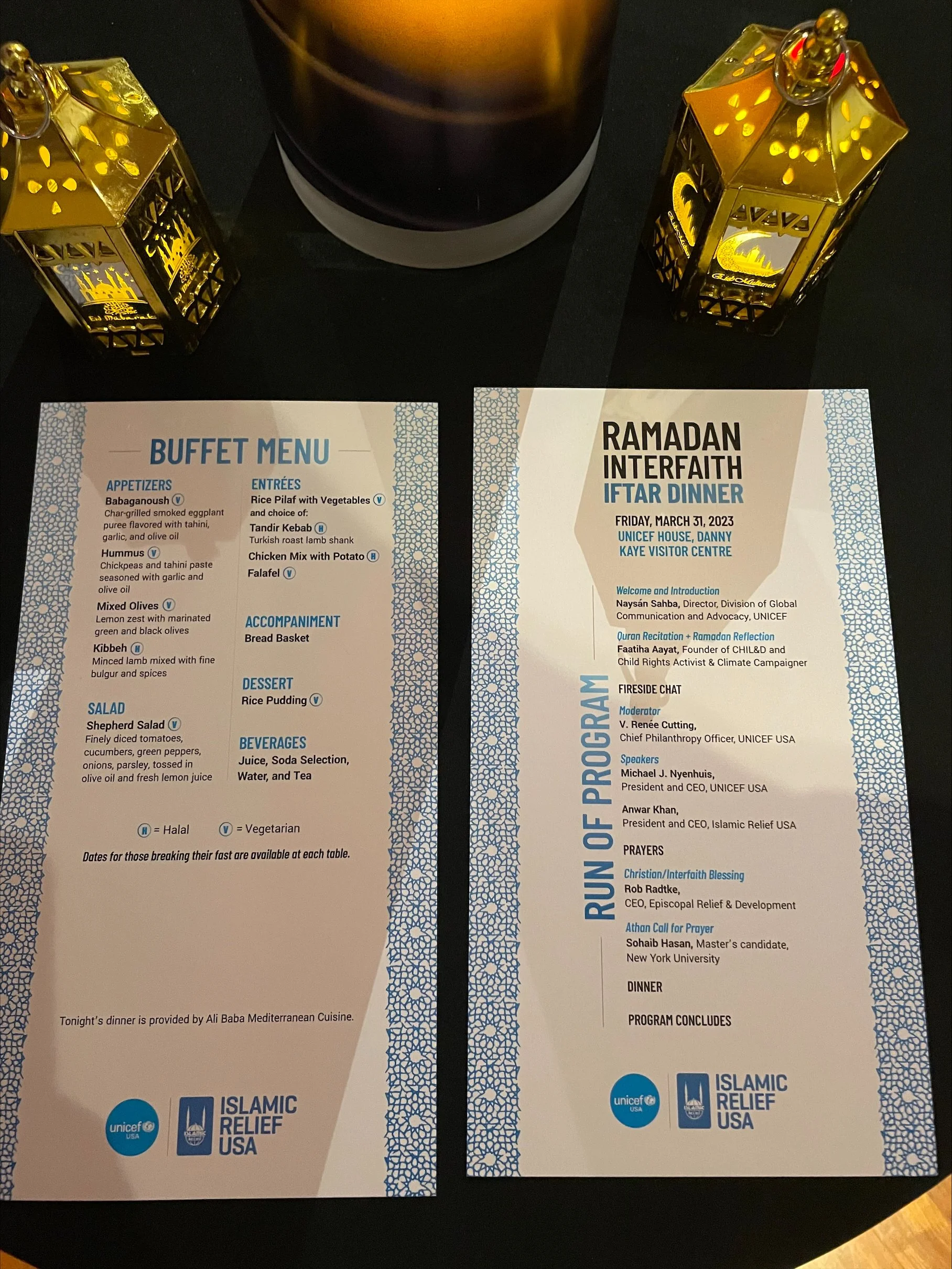 This was a joint interfaith event held by UNICEF USA and Islamic Relief USA in on March 31, 2023 during Ramadan. The purpose of the event was to come together and continue to call for solidarity and generosity towards families and children who are in dire need of humanitarian assistance. Below are pictures of the program and menu I was asked to design by UNICEF USA for the event.